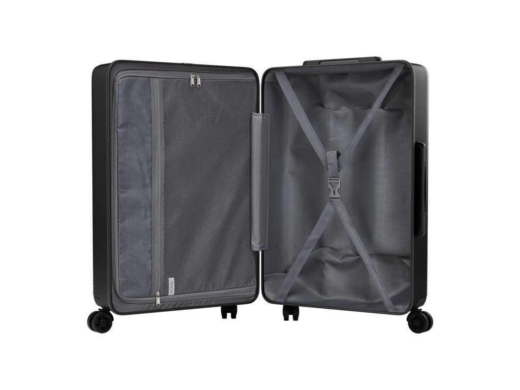 Uvnitř kufru najdete hlavní prostor s fixačními popruhy, které drží oblečení na místě. Dělící přepážka na zip umožňuje oddělit jednotlivé části výbavy a síťované kapsy jsou ideální pro drobnosti, doplňky nebo cestovní potřeby.