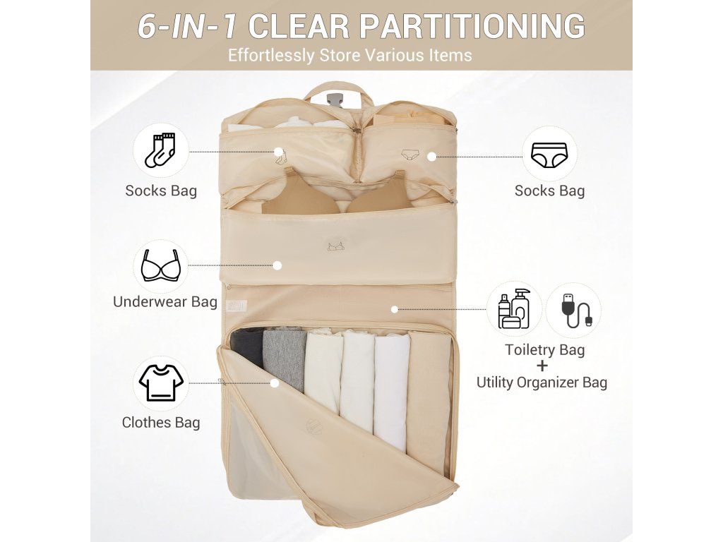 - 🧳 6v1 systém organizace: Sada obsahuje několik samostatných přihrádek pro spodní prádlo, ponožky, podprsenky, oblečení i kosmetiku.
