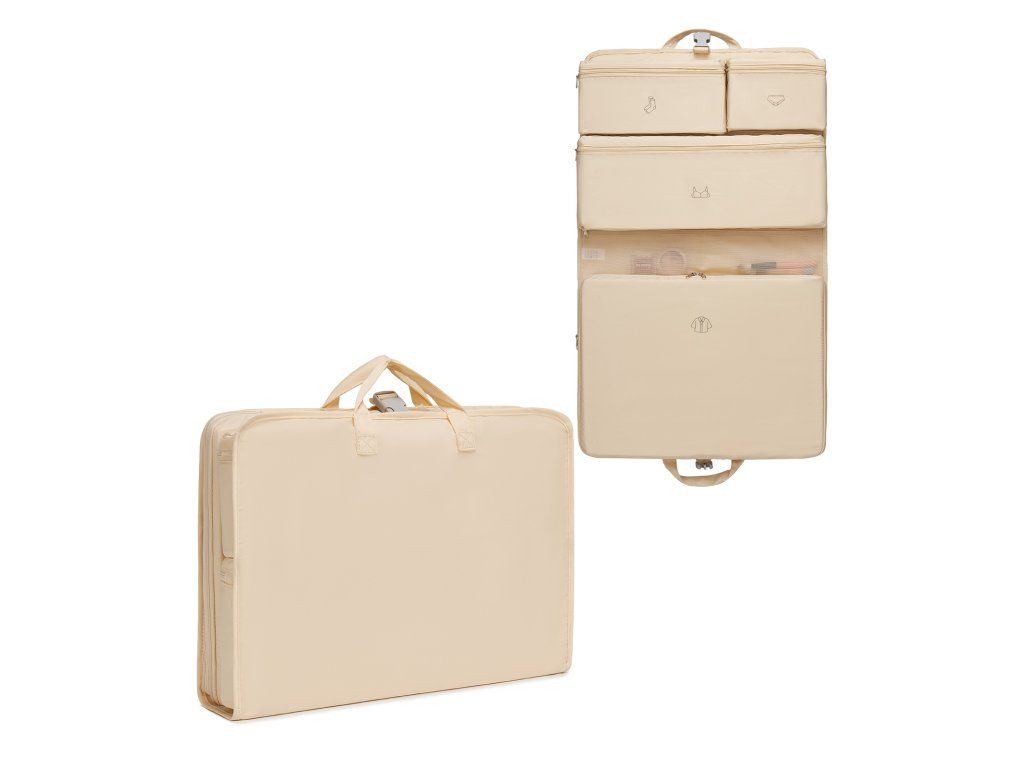Po odepnutí středové přezky lze organizér jednoduše rozložit a využít jeho závěsný systém. V hotelu tak můžete všechny věci pohodlně vyndat z kufru během několika sekund a mít je přehledně uložené. Při zavření funguje organizér jako kompaktní cestovní taška s horním madlem.