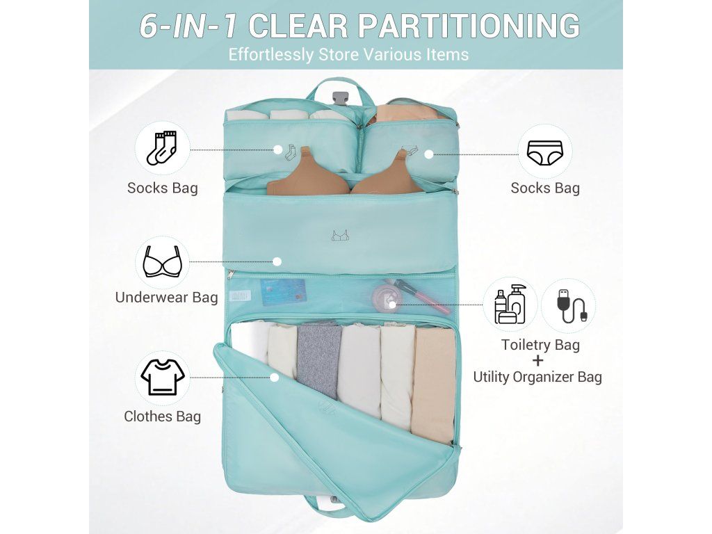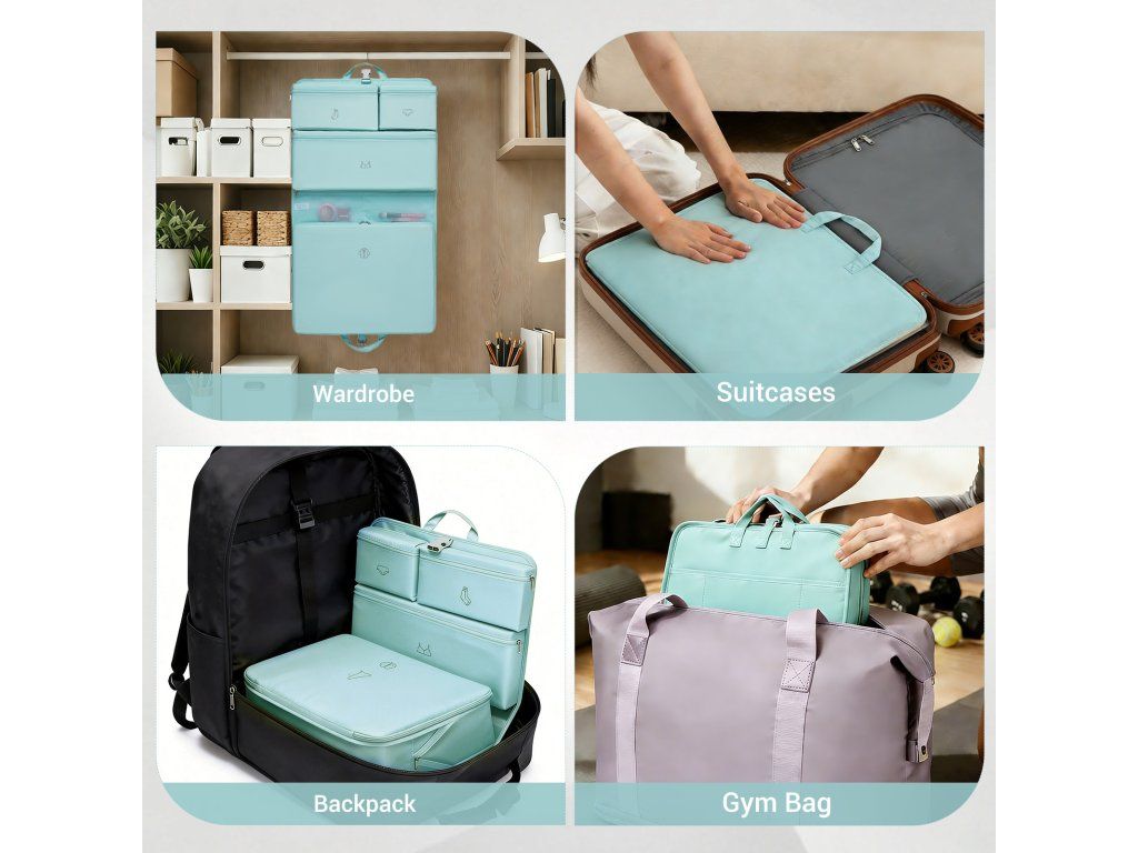 - 🧳 6v1 systém organizace: Sada obsahuje několik samostatných přihrádek pro spodní prádlo, ponožky, podprsenky, oblečení i kosmetiku.