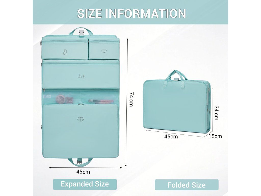 - 🪝 Závěsný systém: Po rozložení můžete organizér jednoduše zavěsit do skříně, koupelny nebo na hotelový věšák.