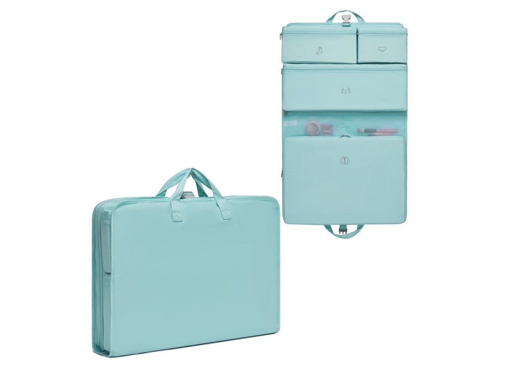 Po odepnutí středové přezky lze organizér jednoduše rozložit a využít jeho závěsný systém. V hotelu tak můžete všechny věci pohodlně vyndat z kufru během několika sekund a mít je přehledně uložené. Při zavření funguje organizér jako kompaktní cestovní taška s horním madlem.