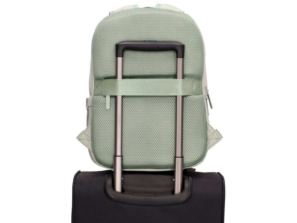 - Popruh na kufr: Zadní pásek umožňuje upevnění na výsuvnou rukojeť zavazadla.