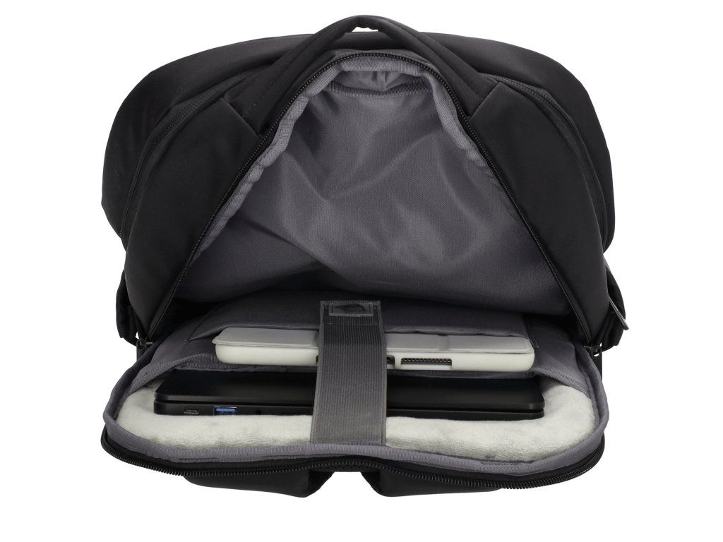 - První komora: Polstrovaná přihrádka na notebook (15,6", 34,5 x 19,4 cm) a tablet.