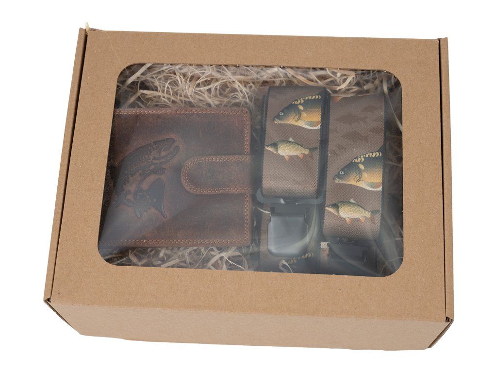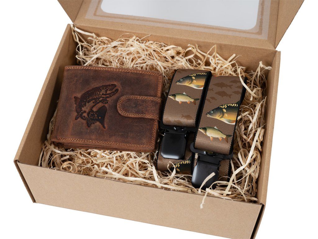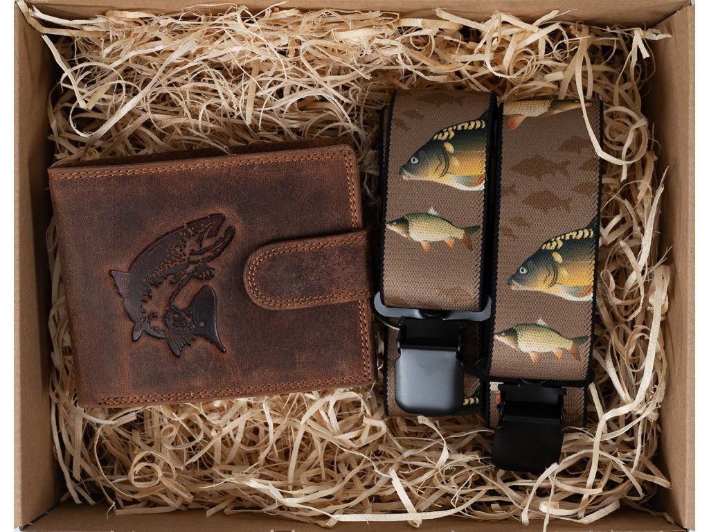 Dárkový set pro muže - Kožená peněženka a kšandy - Rybář - Hnědá