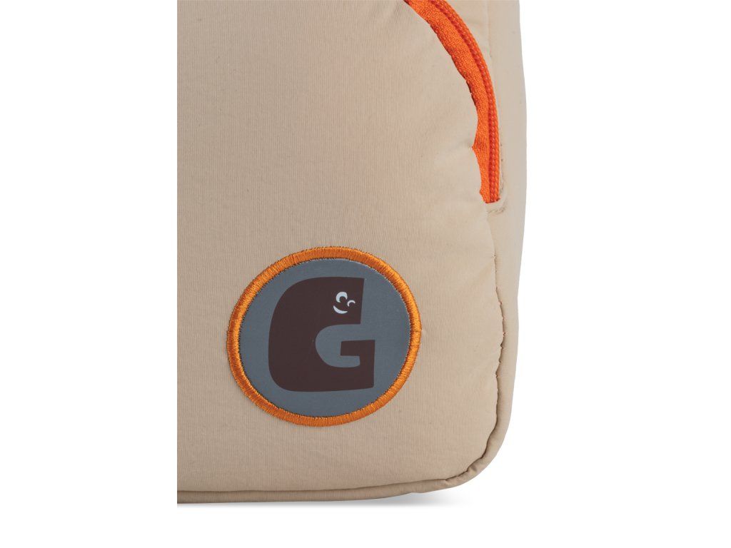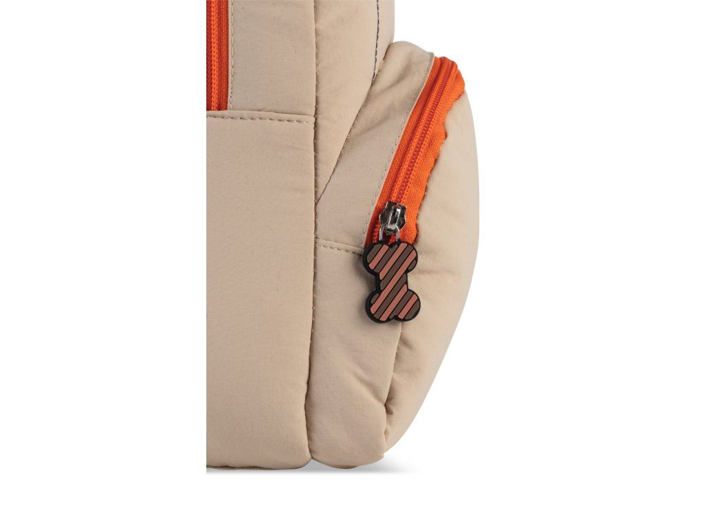 - Barevné detaily: Oranžový zip a hravý přívěsek v podobě packy.