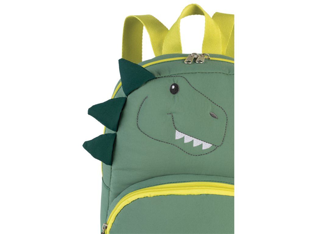 - Výšivka dinosaura: Usměvavá tvář a detailní prošití dodávají batohu osobitý výraz.