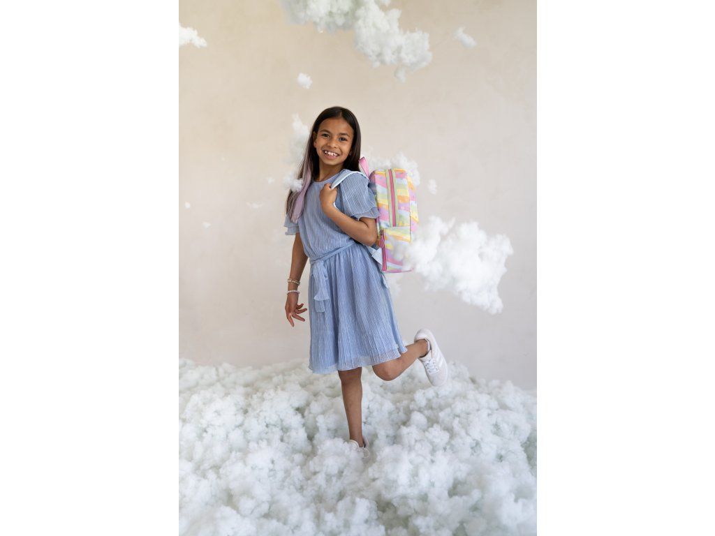 Nastavitelné ramenní popruhy se dají sepnout přezkou vpředu, což zajistí pohodlné a stabilní nošení i u menších dětí. Na zadní straně je praktický štítek na jméno, takže batoh se snadno identifikuje a neztratí.