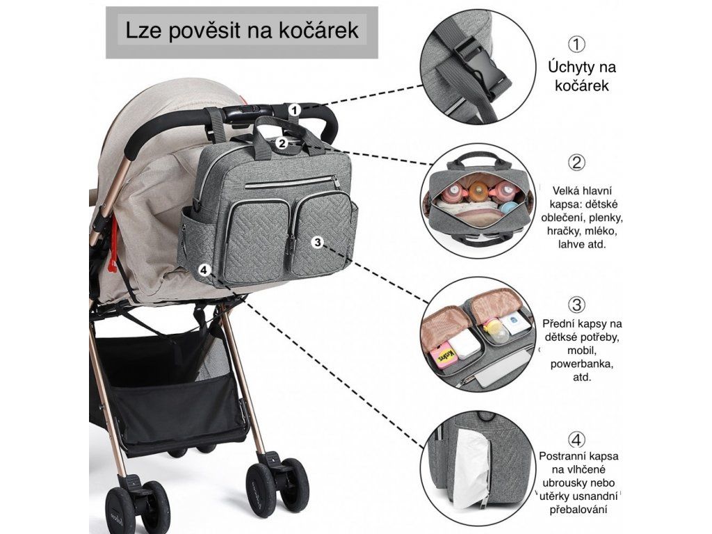 - Snadné připevnění na kočárek pomocí praktických popruhů.