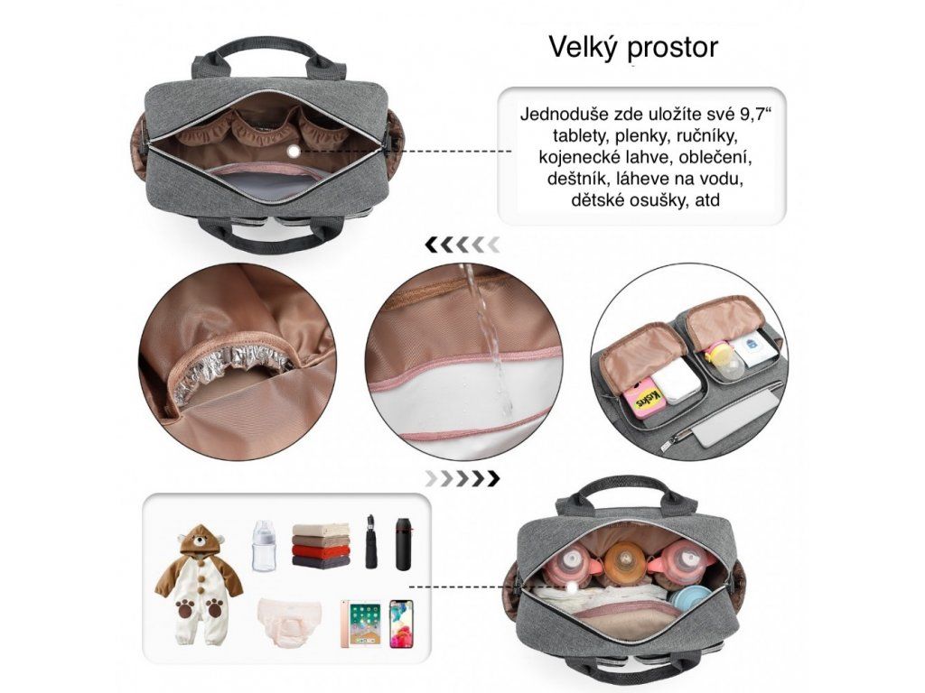 - Dostatek místa pro pleny, oblečení, ručníky i toaletní potřeby.