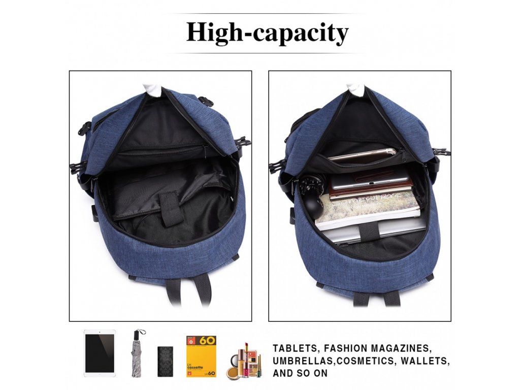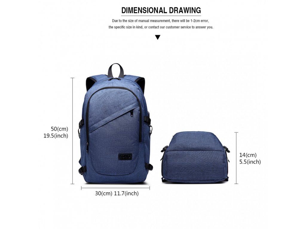 KONO unisex batoh s USB portem - modrý - 20L