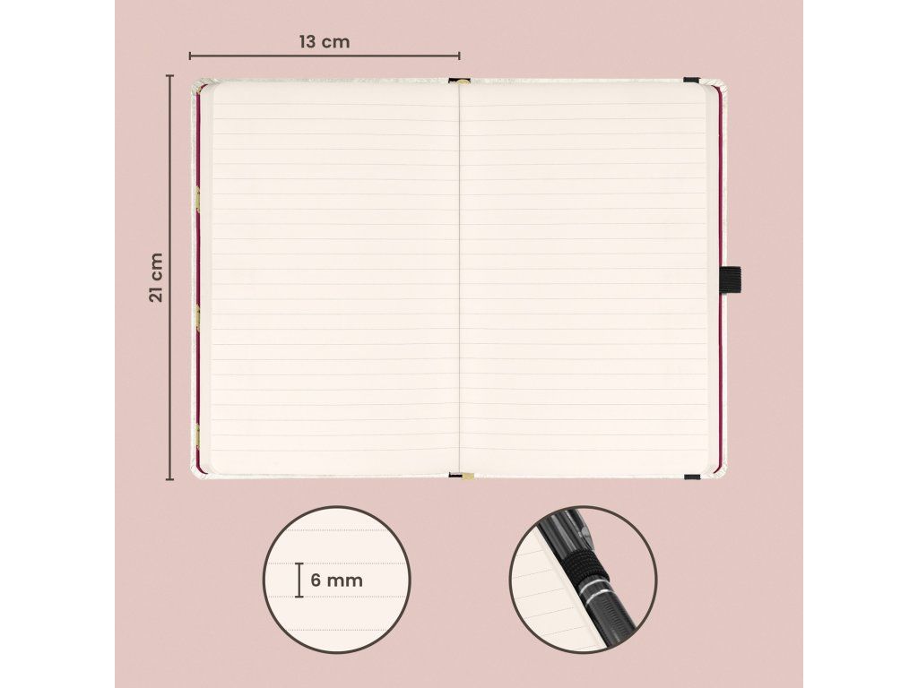 - Vazba: pevná knižní vazba s gumičkou a poutkem na tužku