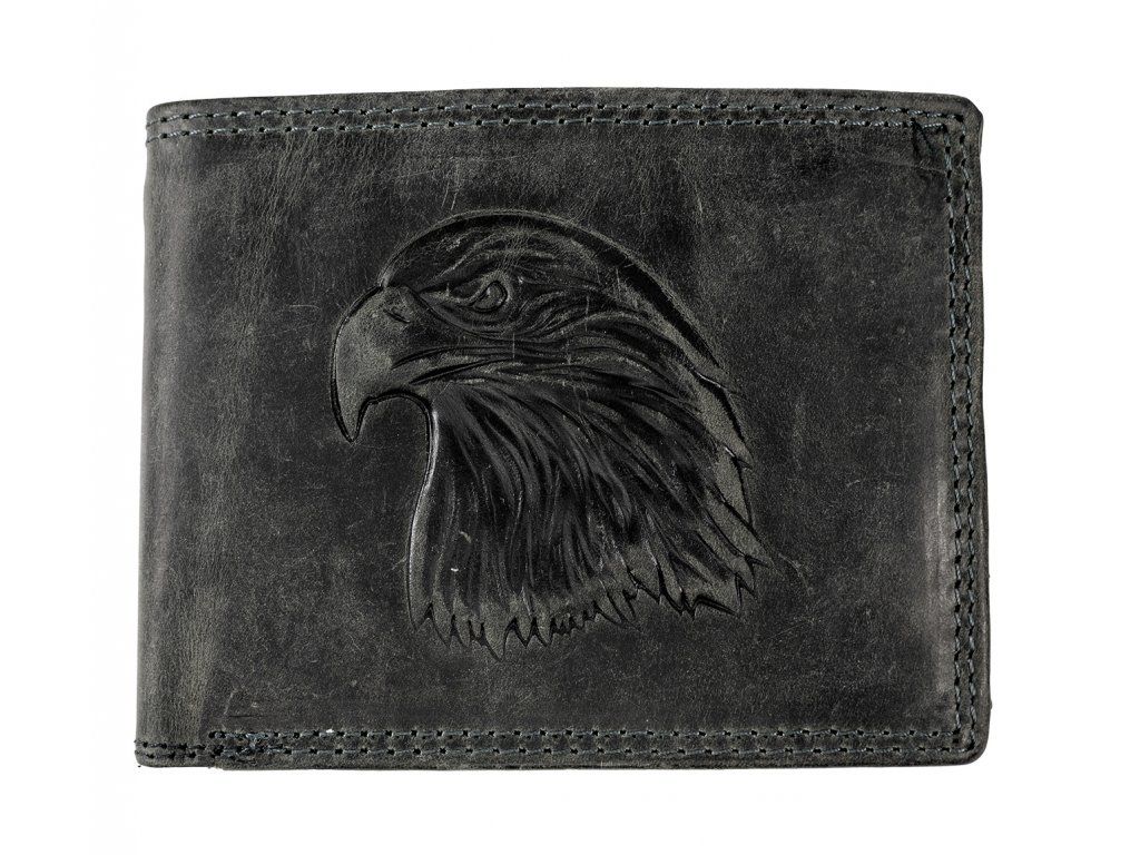 Luxusní pánská kožená peněženka vyrobená z kvalitní a pevné přírodní černé kůže v černé barvě s reliéfním obrázkem orla.