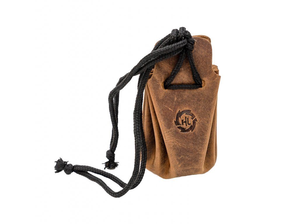 Luxusní kožený měšec vyrobený z kvalitní a pevné pravé hnědé kůže s vyraženým znakem HL přímo do kůže.