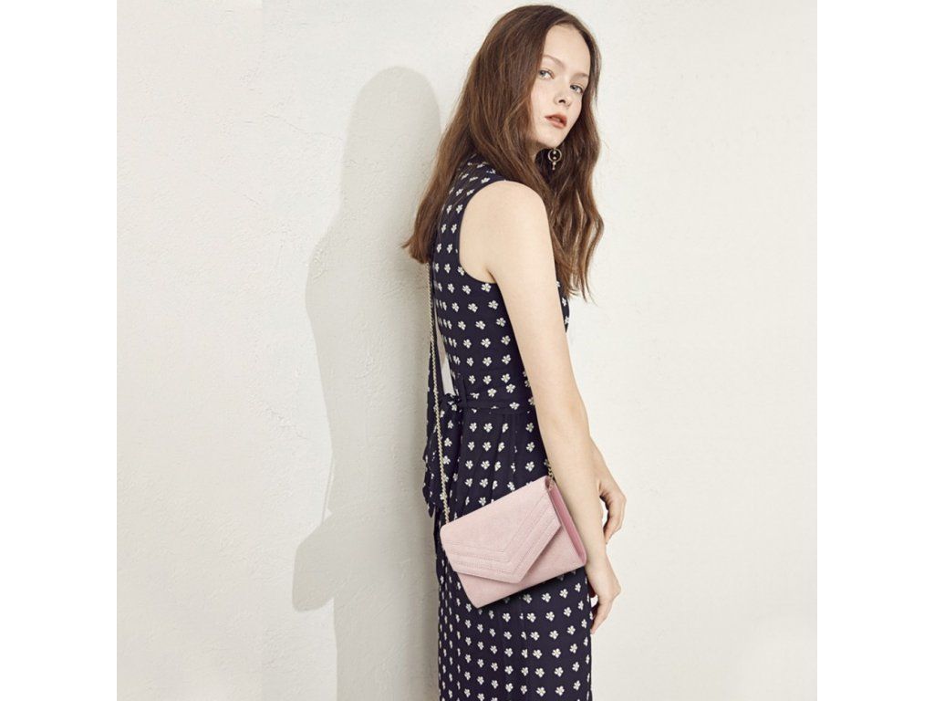 Na přední straně tašky je vyvýšený, prošívaný detail obálky ve tvaru V.