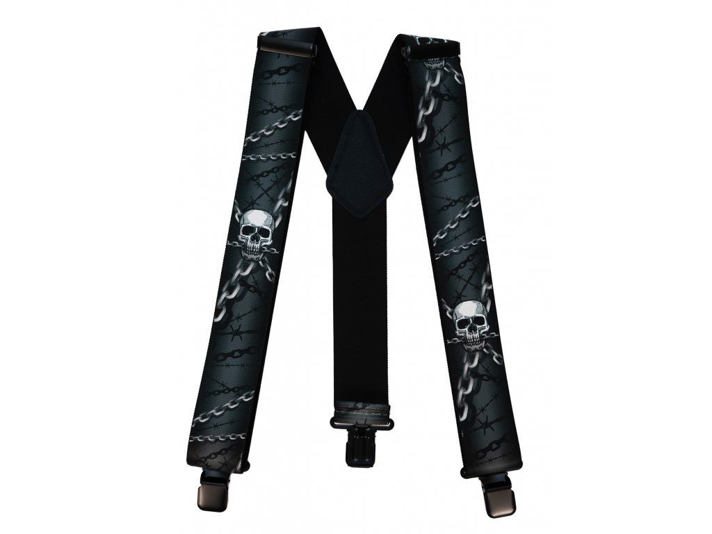 Naše kšandy jsou navrženy tak, aby poskytovaly stabilitu i během dlouhých jízd. Šířka 5 cm zajišťuje pohodlné rozložení váhy a maximální oporu, což umožňuje volný pohyb bez omezení. Motiv lebek dodává kšandám nezaměnitelný vzhled, který podtrhne váš osobitý styl a vášeň pro jízdu.