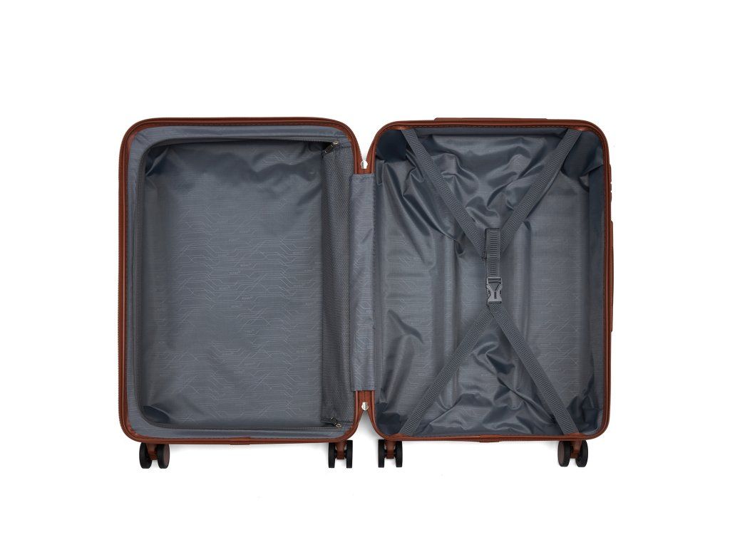 Kufr zaujme horizontálním vzorem a stylovými hnědými detaily, které dodávají celkovému vzhledu sofistikovaný charakter. Teleskopická rukojeť z pevného kovu je nastavitelná podle výšky pro pohodlné ovládání.