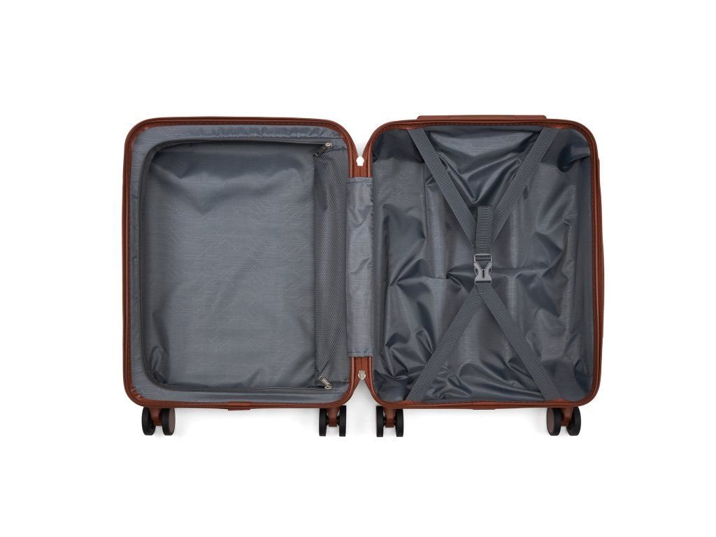 Elegantní horizontální linie v kombinaci s hnědými detaily dodávají kufru sofistikovaný vzhled. Teleskopická rukojeť z pevného kovu je nastavitelná podle výšky postavy, což zaručuje maximální komfort při přesunu.