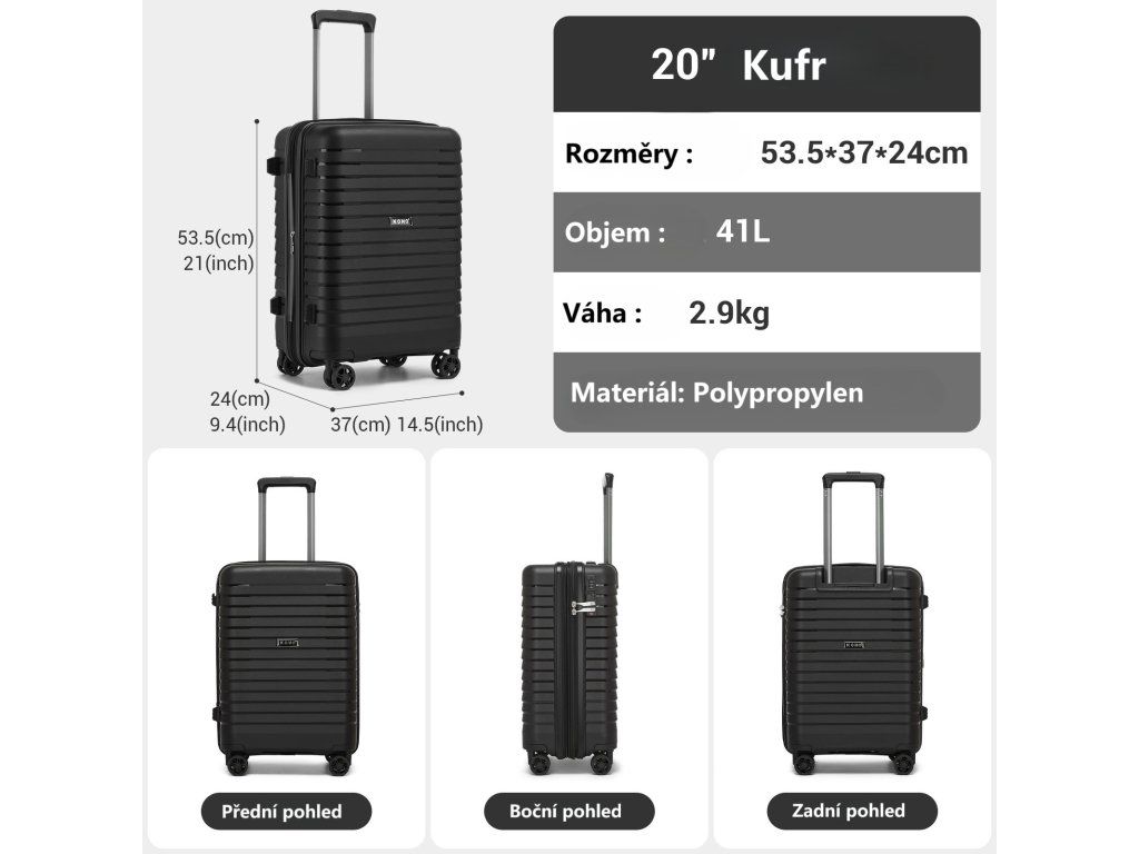 - 20" model: 53,5 cm (V) x 37 cm (Š) x 24 cm (H), hmotnost 2,9 kg, objem přibližně 41 l