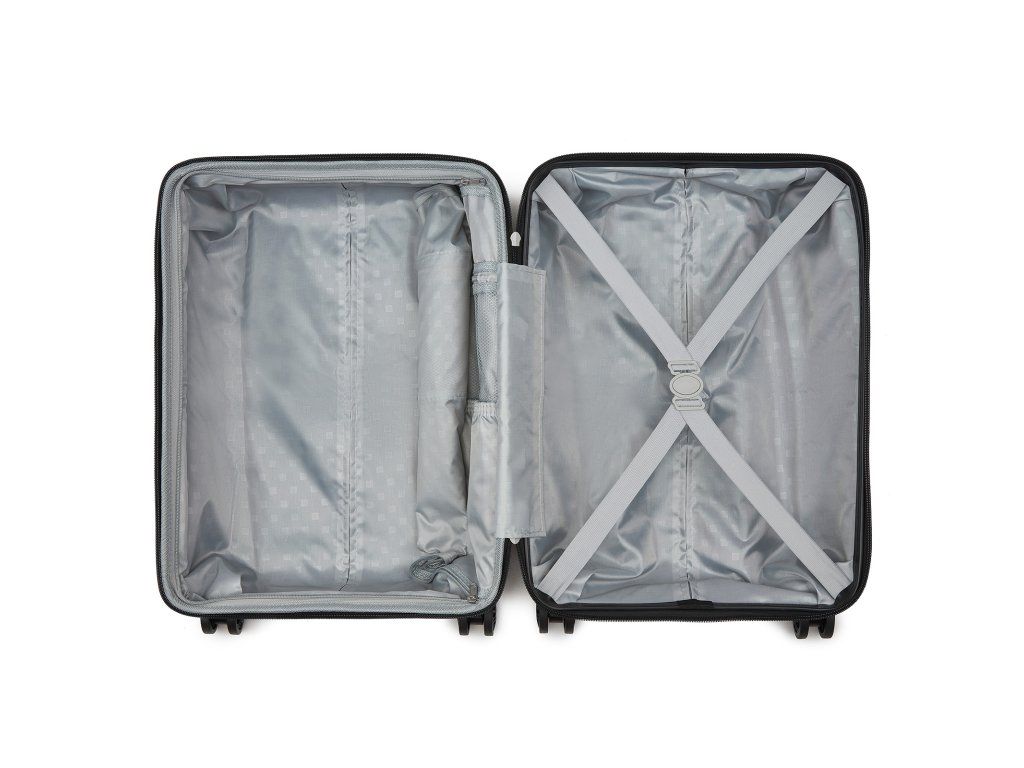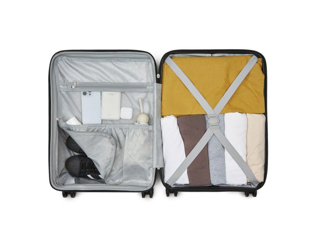 Vnitřní uspořádání kufru nabízí promyšlené řešení pro přehledné balení. Jedna strana je vybavená síťovanou kapsou a menšími přihrádkami pro drobnosti, druhá strana má křížové popruhy pro zajištění oblečení. Vše zůstane úhledné a přehledné, i když je kufr zcela zaplněn.