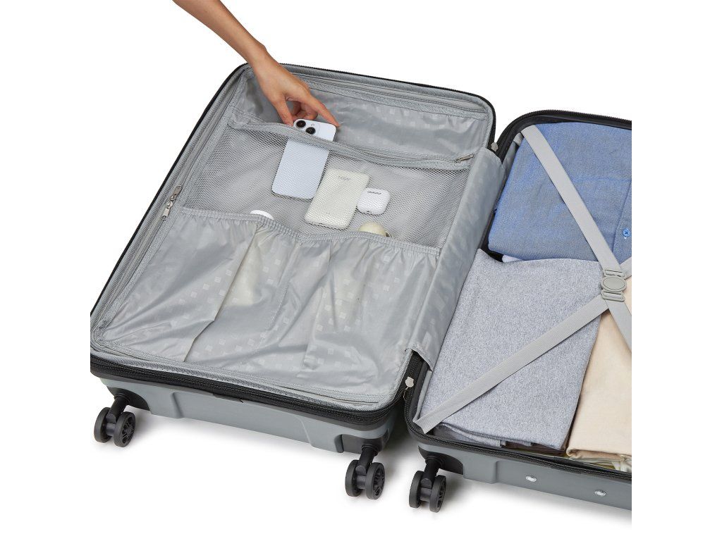 Vnitřní uspořádání kufru nabízí promyšlené řešení pro přehledné balení. Jedna strana je vybavená síťovanou kapsou a menšími přihrádkami pro drobnosti, druhá strana má křížové popruhy pro zajištění oblečení. Vše zůstane úhledné a přehledné, i když je kufr zcela zaplněn.