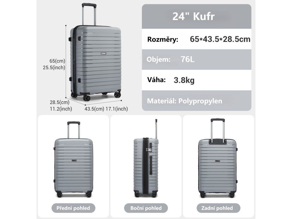 - 24" model: 65 cm (V) x 43,5 cm (Š) x 28,5 cm (H), hmotnost 3,8 kg, objem přibližně 76 l
