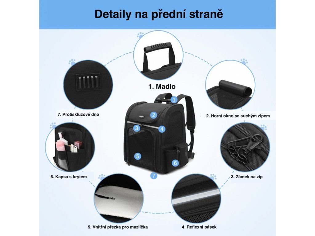 - Stabilní konstrukce: Ocelový rám zajišťuje, že batoh drží tvar a nehroutí se, čímž zvyšuje bezpečnost vašeho mazlíčka.