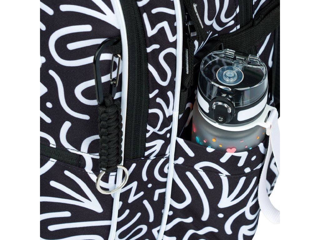 - Boční kapsy: Zpevněné, ideální na láhev s pitím nebo drobnosti.
