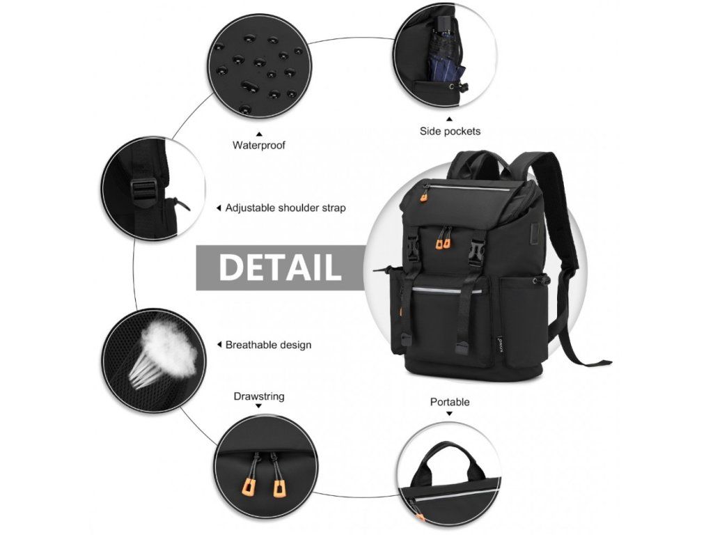 - Praktické vnější kapsy: Přední kapsa se zipem pro rychlý přístup, boční nastavitelné kapsy na láhve či deštník.
