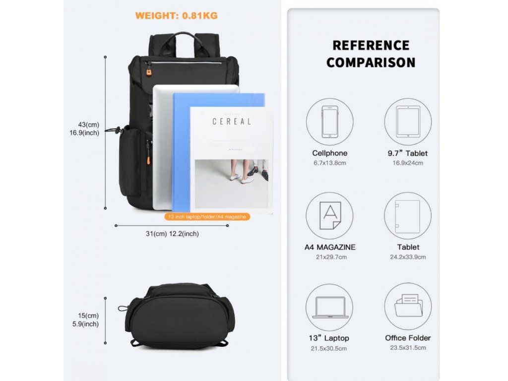 Dostatek prostoru pro A4 formát a kompatibilita s většinou tabletů a notebooků do velikosti 15,6". Před nákupem ověřte rozměry svého zařízení.