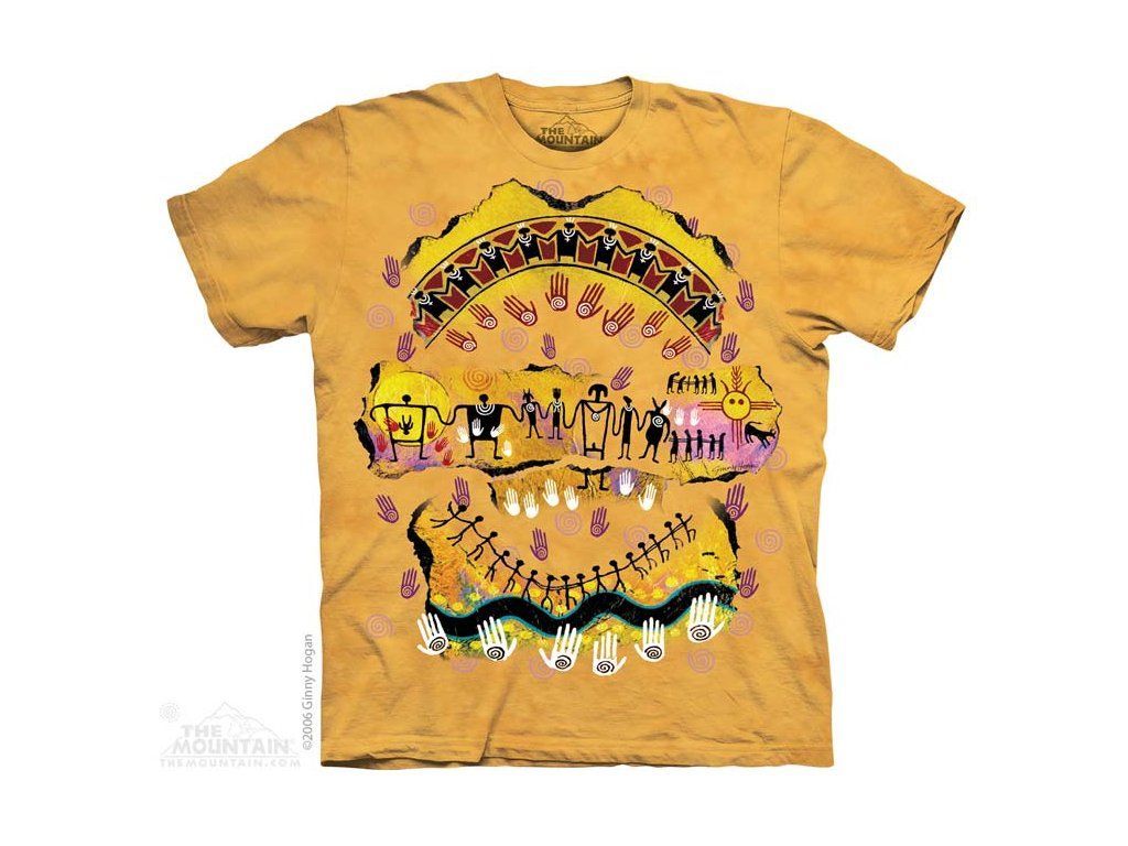 Tento model nepůsobí jako obyčejné tričko s potiskem. Naopak zaujme svou symbolikou, jednoduchostí znaků i silnou výtvarnou atmosférou. Motiv připomíná pradávné skalní malby, petroglyfy a obrazový jazyk kultur, které vyprávěly příběhy pomocí postav, slunce, zvířat, linií a ručních otisků. Právě proto je toto tričko ideální pro každého, kdo hledá originální tričko s etnickým motivem, batikované tričko se symboly nebo umělecké tričko The Mountain s neobvyklým designem.