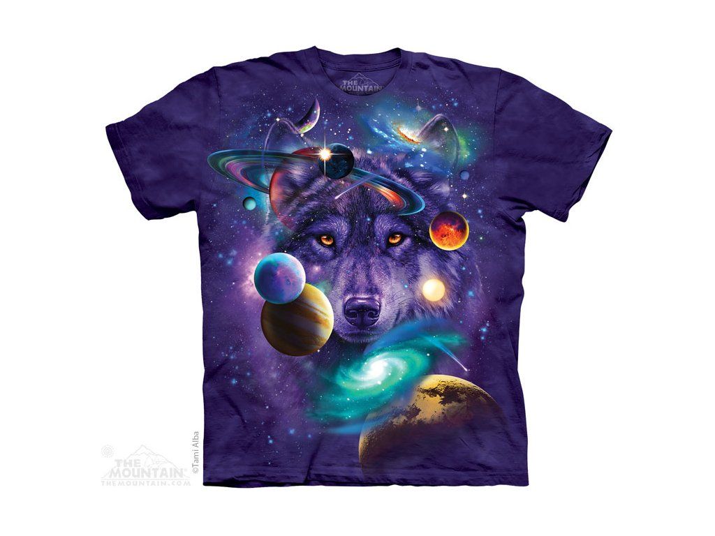 Bavlněné batikované tričko se speciálním patentovaným potiskem Vesmírný vlk. Střední gramáž, rovný volný střih, 100% bavlna. Kvalitní americká značka ekologických triček The Mountain. Ve fialovém provedení.