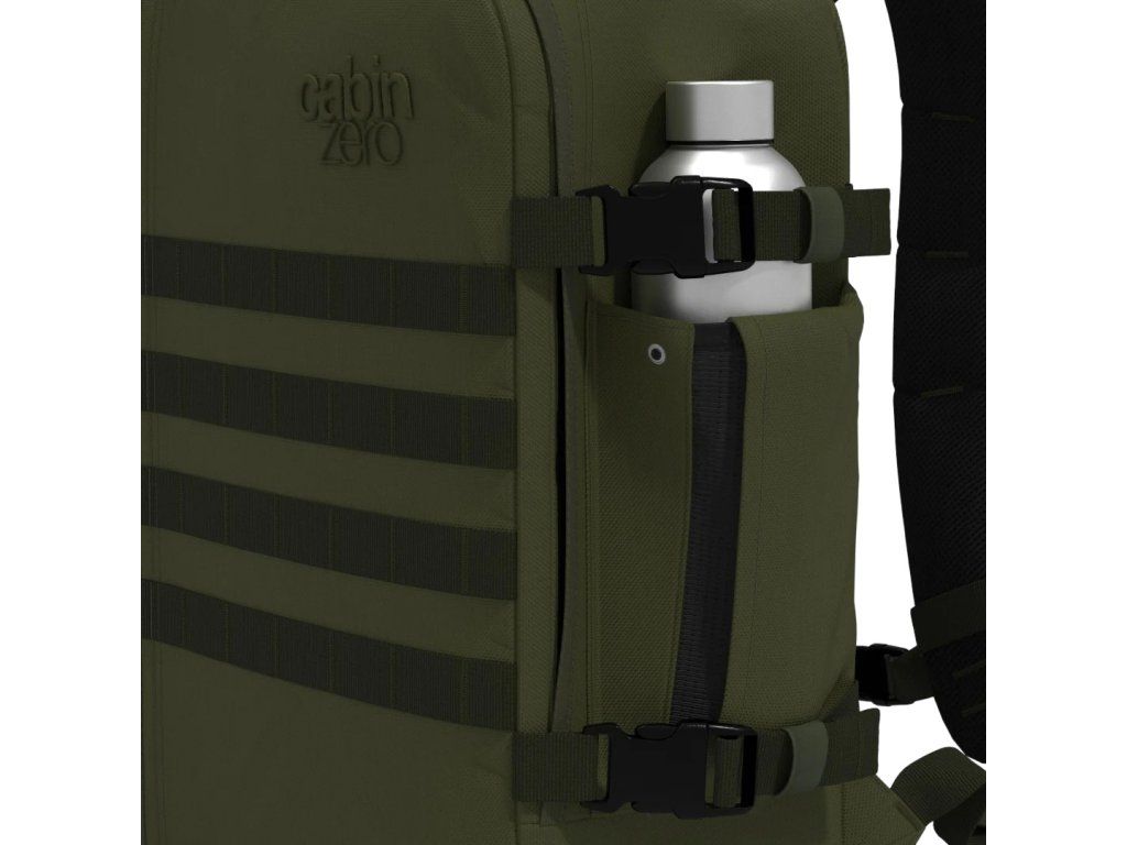 Hlavní komora se otevírá jako kufr. Uvnitř najdete síťovanou kapsu na zip, kapsu na dokumenty a polstrovanou přihrádku na notebook. Na přední straně je kapsa na drobnosti, boční kapsa na láhev a MOLLE systém pro uchycení dalšího vybavení.